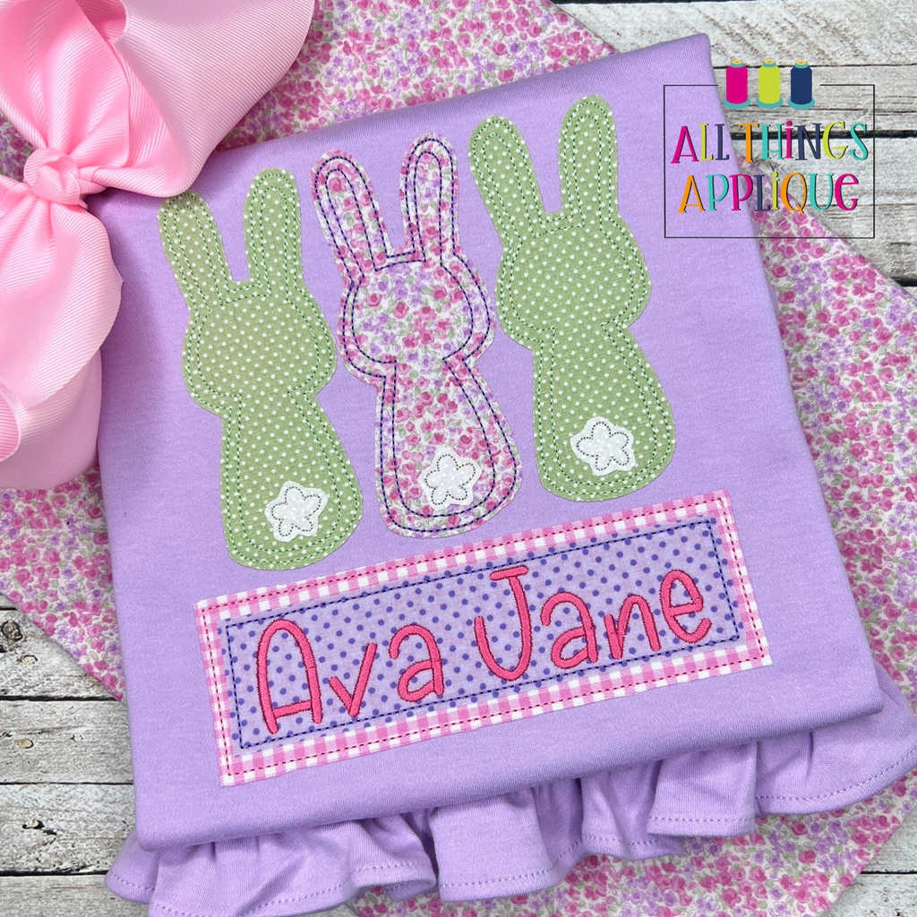 Hop into cuteness with this playful bunny trio applique design! Three adorable bunnies sit on top of a personalized name frame, perfect for adding a whimsical touch to nursery décor, clothing, or quilts.