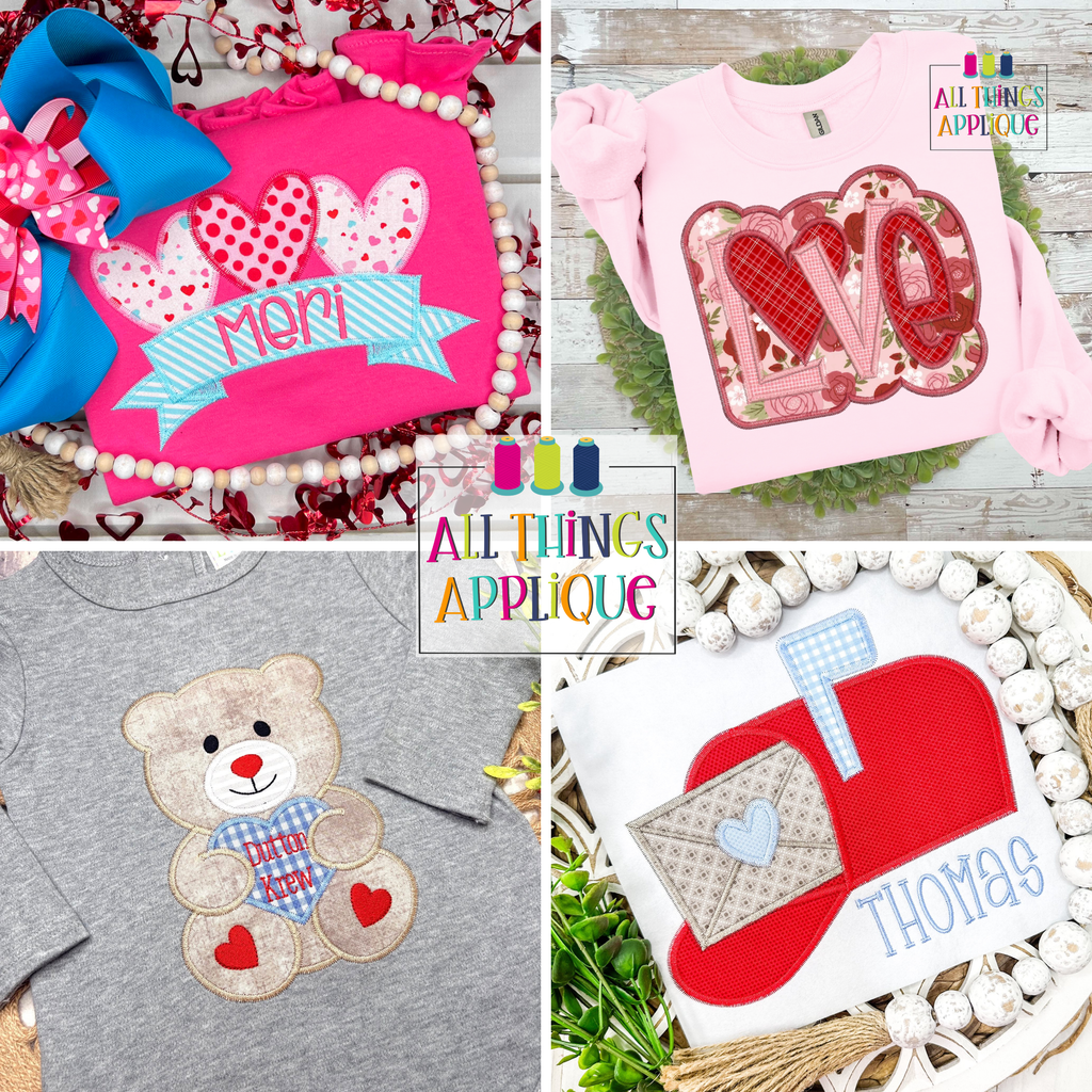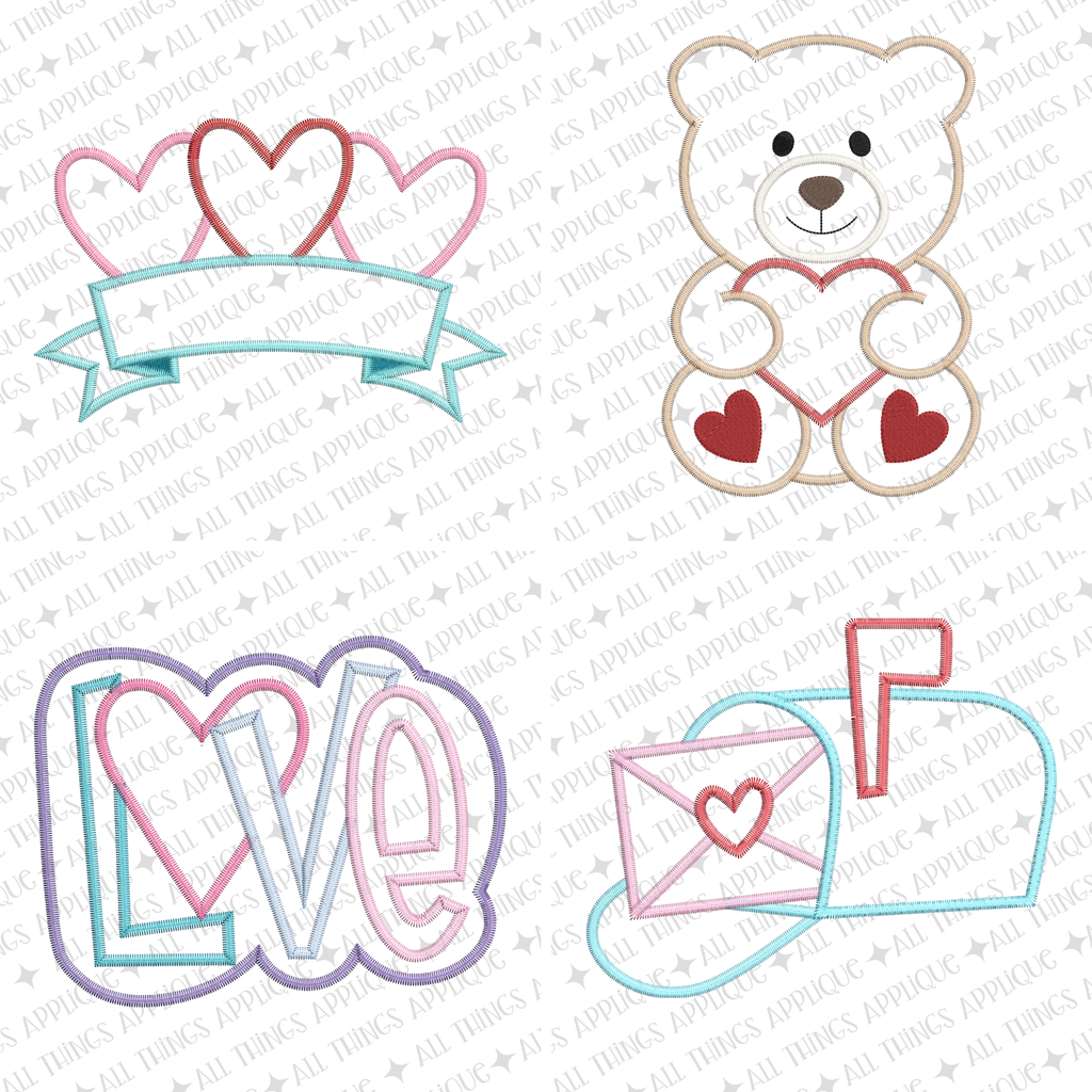 This design bundle includes 4 Valentine Zig Zag Stitch Applique Designs created/digitized in 2026 by All Things Applique for use on your embroidery machine.
