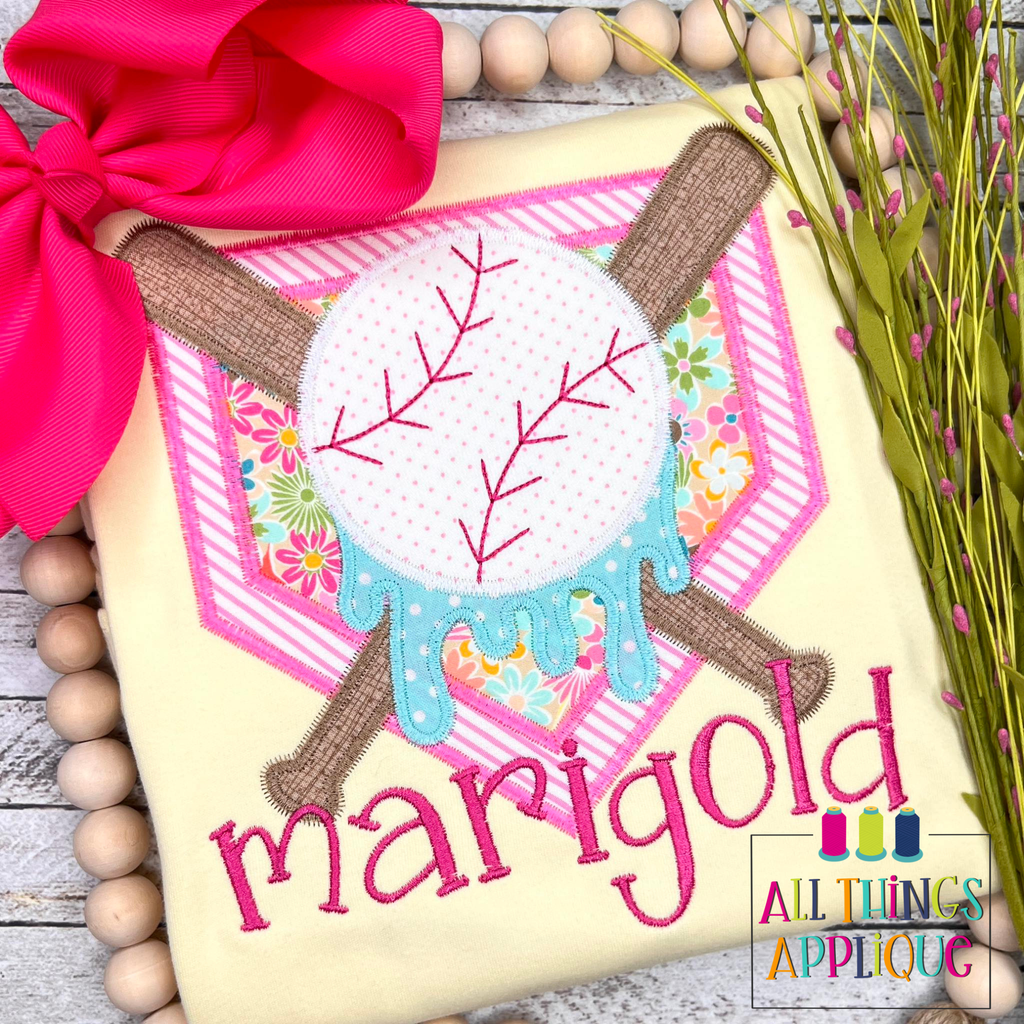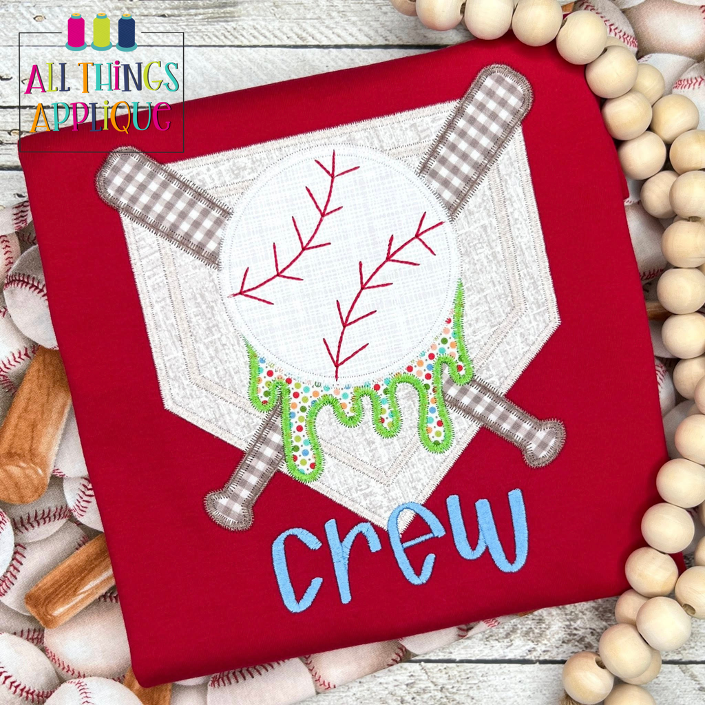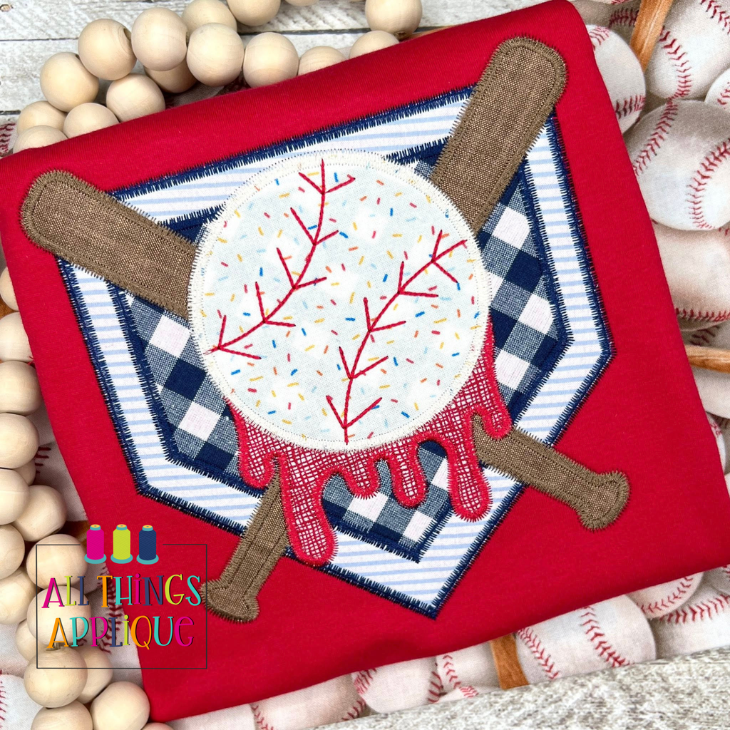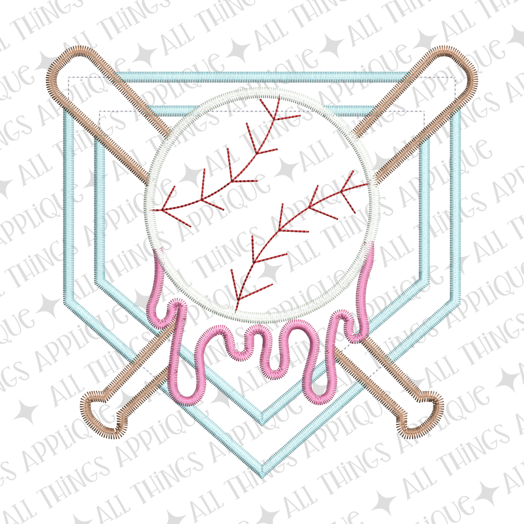 Strike out the competition with this baseball applique design featuring a home plate, bat, ball, and signature drip effect. Perfect for baseball fans, this zig zag stitch design delivers a playful, quick stitch finish that adds character to any project.