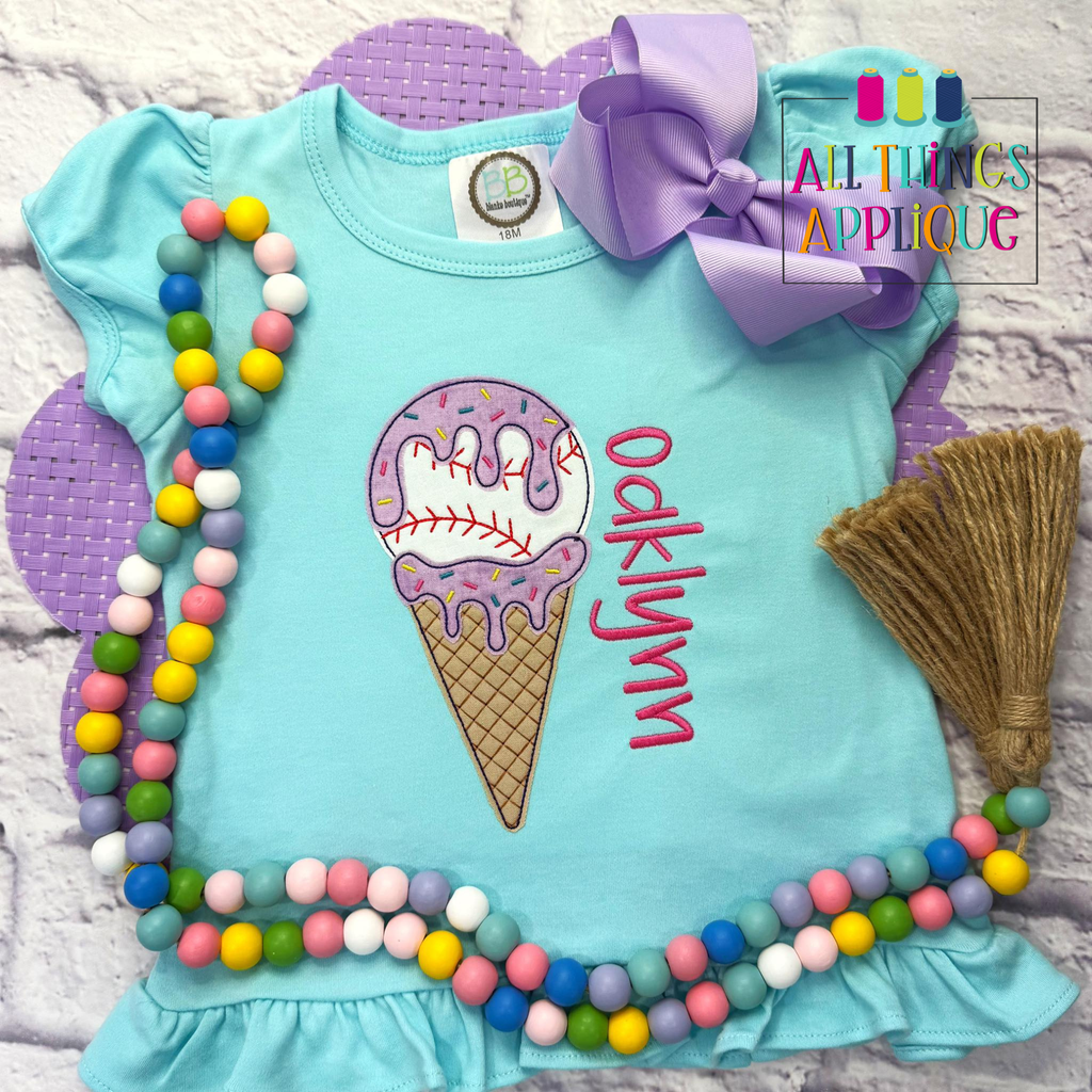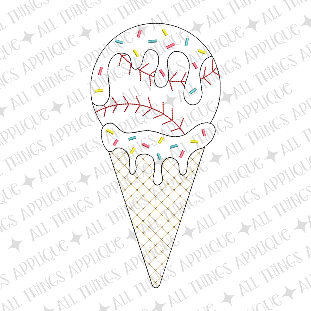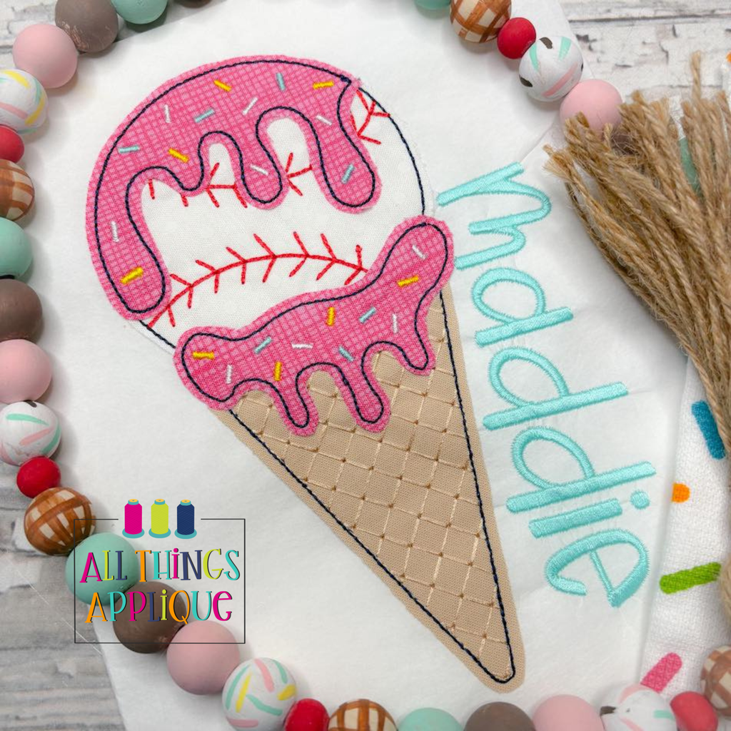 A playful twist on two summer favorites, this ice cream cone appliqué design features a scoop styled like a classic baseball, complete with red stitching details. The “melting” drip cascades down the cone for a fun, whimsical effect, blending sporty charm with sweet treat vibes. Perfect for game days, little league outfits, or anyone who loves baseball season and ice cream, this design adds a lighthearted, all-American touch to shirts, totes, and more.