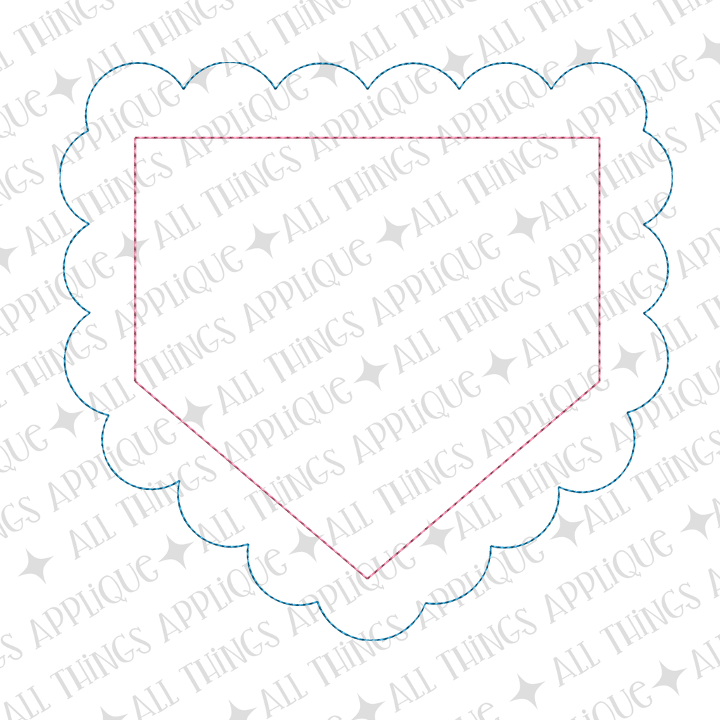 Add a soft, stylish twist to a classic baseball motif with this home plate appliqué design. Featuring two layers, the bottom layer is finished with a sweet scalloped edge that adds a touch of charm and dimension. Customize your look by stitching both layers for a full, layered effect, using just one for a simpler style, or cutting out the center for a fun, airy design. Personalize it with your favorite team name in the font you love to make it uniquely yours. Perfect for game day outfits, accessories, and gifts, this design blends sporty spirit with a hint of sweetness.