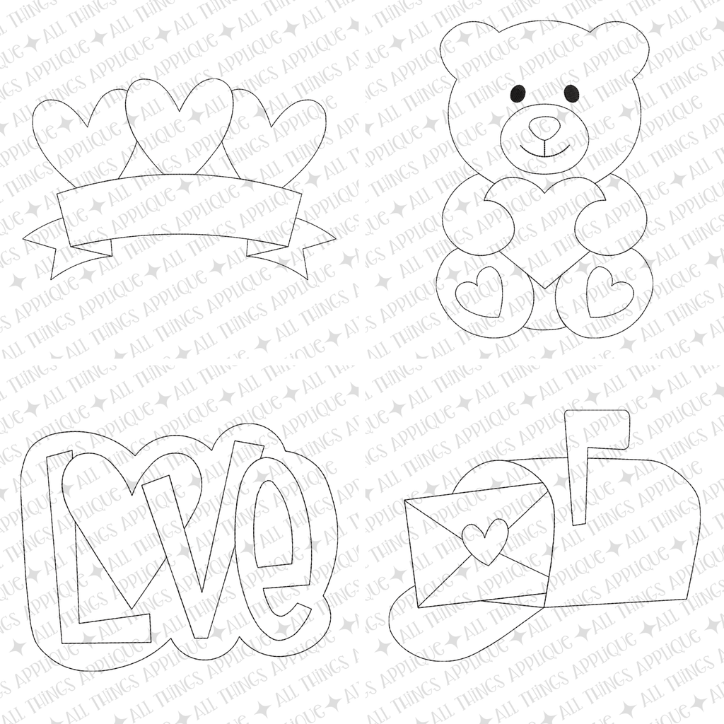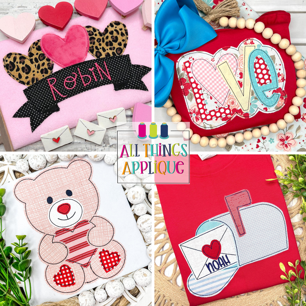 This design bundle includes 4 Valentine Bean Stitch Applique Designs created/digitized in 2026 by All Things Applique for use on your embroidery machine.