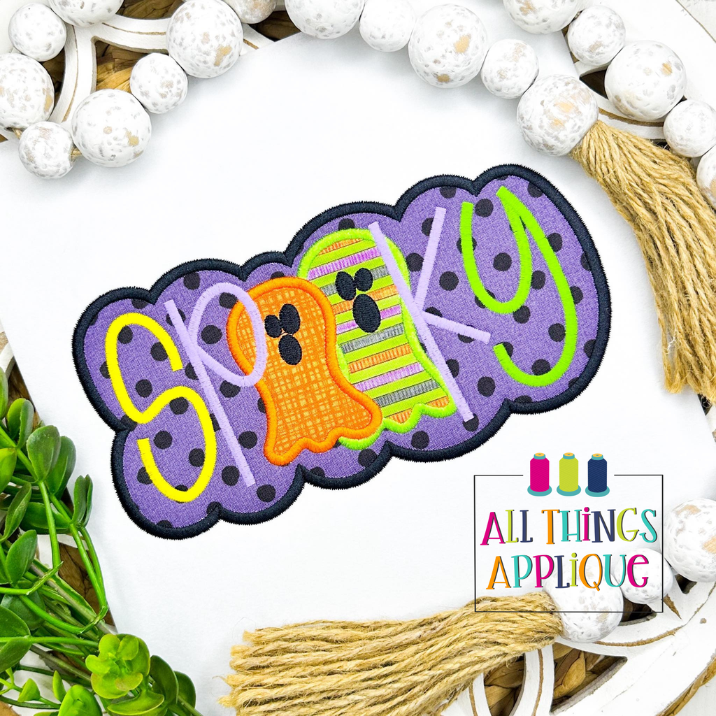 Bring some playful charm to your Halloween projects with this "Spooky" applique design. Featuring hand lettering and two adorable ghosts nestled in the center, it adds a fun and festive touch to any fabric creation. Perfect for spooky season crafts that delight without fright!