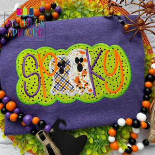 Bring some playful charm to your Halloween projects with this "Spooky" applique design. Featuring hand lettering and two adorable ghosts nestled in the center, it adds a fun and festive touch to any fabric creation. Perfect for spooky season crafts that delight without fright!