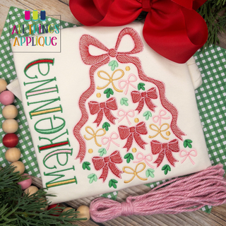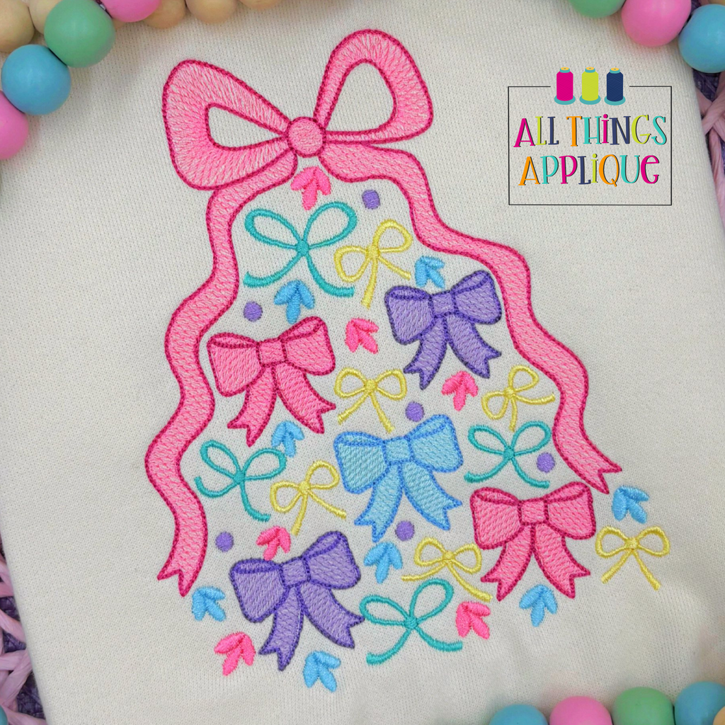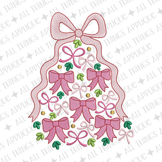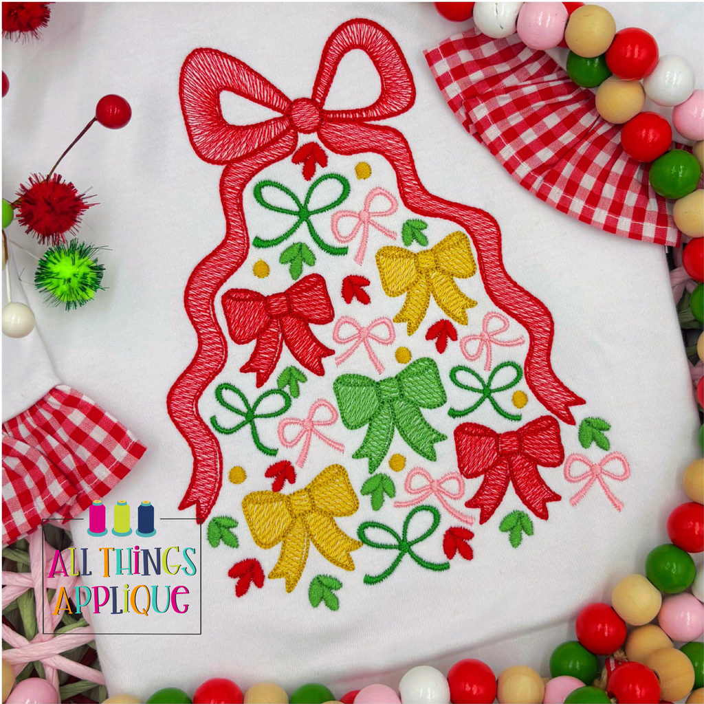 This charming embroidery design features a whimsical Christmas tree adorned with an abundance of decorative bows in a delightful sketch style. Perfect for adding a touch of holiday cheer to pillows, stockings, tote bags, or clothing.