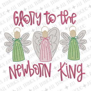 Celebrate the season with this charming sketch stitch embroidery design featuring three heavenly angels proclaiming "Glory to the Newborn King."