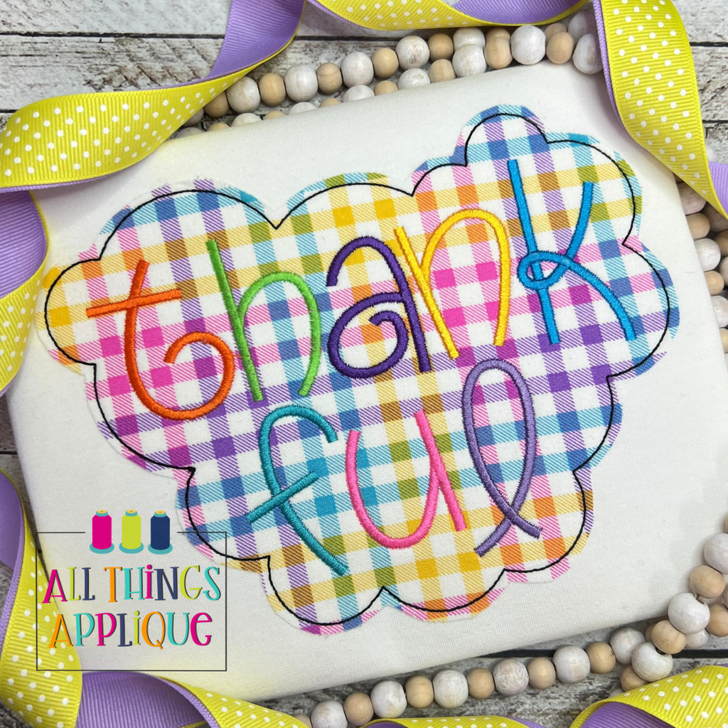 Celebrate gratitude in style with this charming hand-lettered applique design! Perfect for adding a warm, heartfelt touch to pillows, tote bags, quilts, or wall hangings. Whether you're stitching gifts for loved ones or decorating your own space, this design spreads good vibes and reminds everyone what matters most. A delightful way to stitch kindness into your creations!