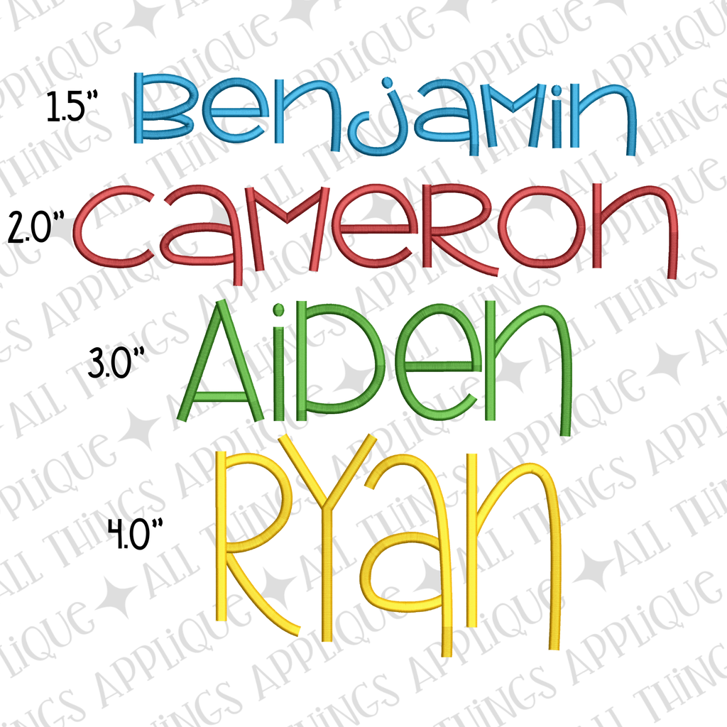 Bring personality to your projects with Cameron, a clean and simple embroidery font that's perfect for adding a playful touch to any design. Available in five versatile sizes, this font works beautifully on everything from monograms to beach towels to personalized shirts and more. Its straightforward letterforms make it easy to stitch while maintaining charming character. Ideal for beginners and experienced embroiderers alike, Cameron delivers professional results with effortless style.