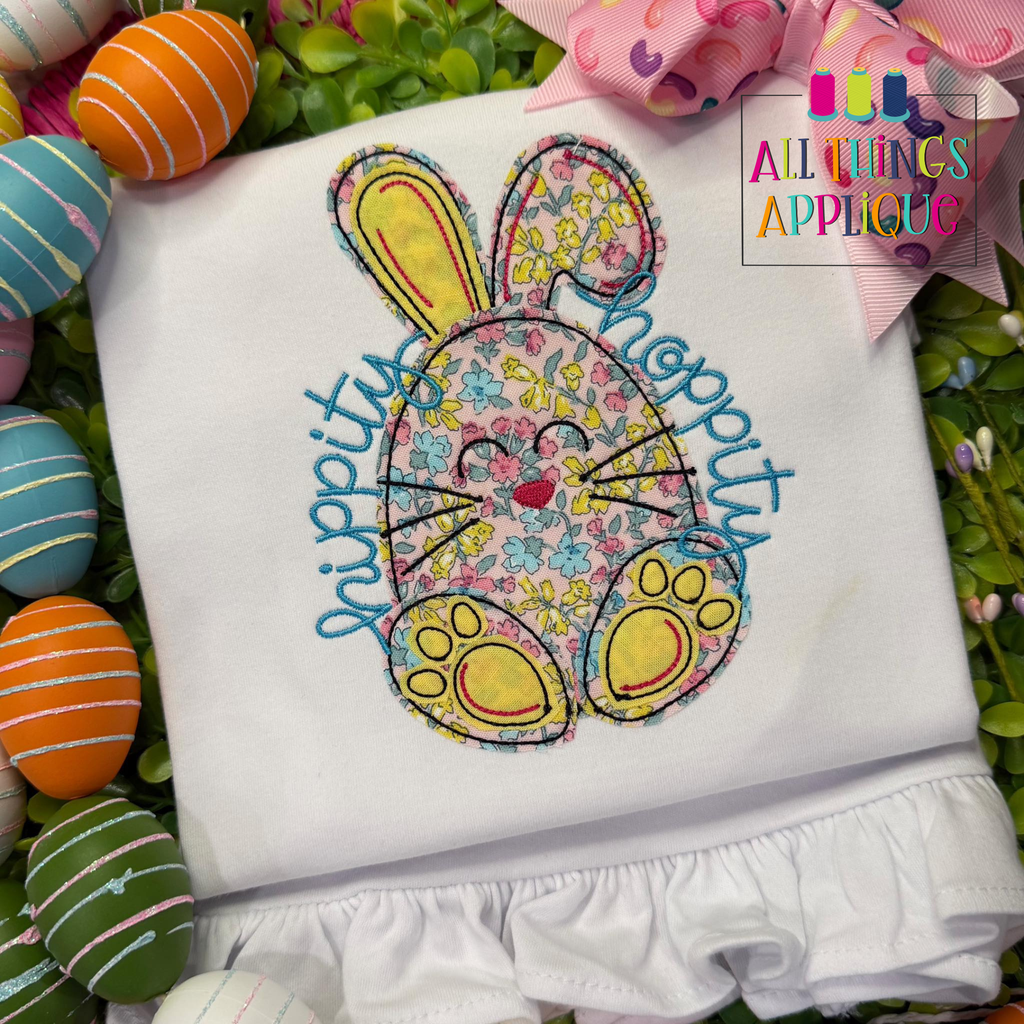 Hop into springtime fun with this adorable Easter bunny applique featuring a sweet, bouncy bunny design paired with "Hippity Hoppity" in charming cursive lettering.