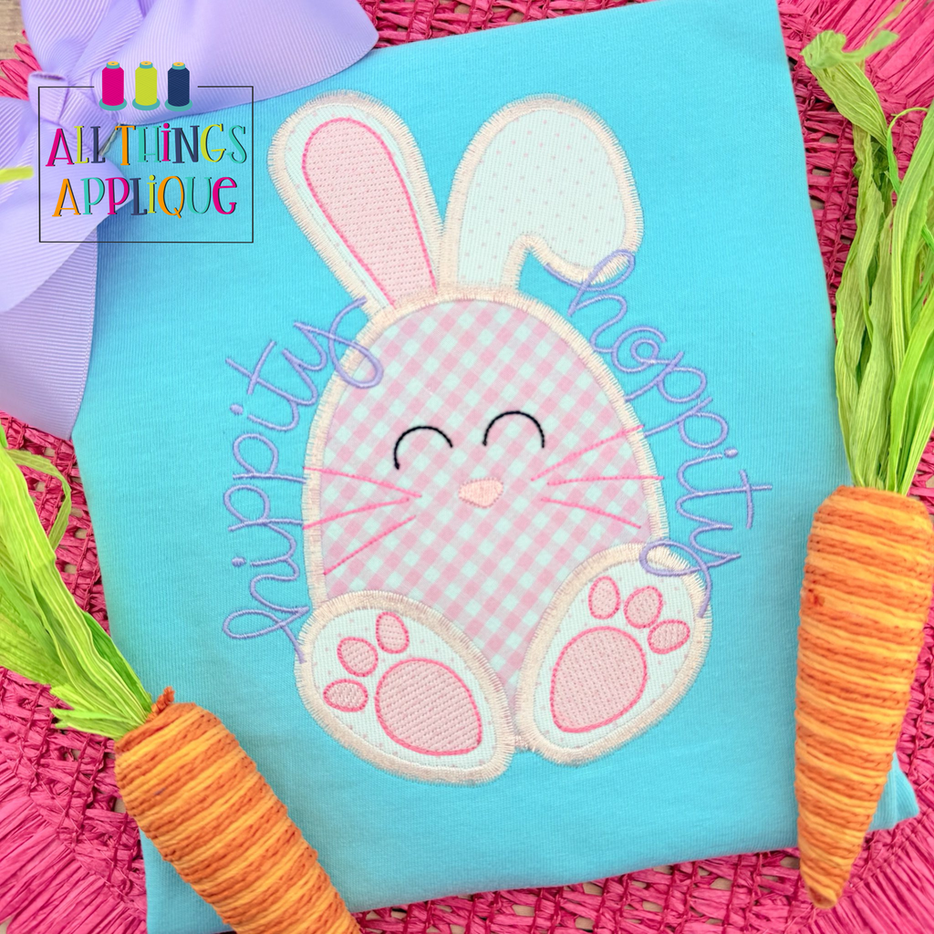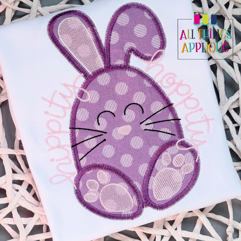 Hop into springtime fun with this adorable Easter bunny applique featuring a sweet, bouncy bunny design paired with "Hippity Hoppity" in charming cursive lettering.