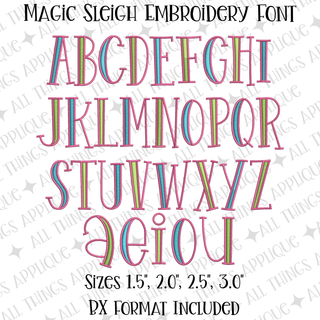 Bring holiday magic to your projects with this enchanting embroidery font! Perfect for festive designs, Magic Sleigh features a charming two-color style that adds dimension and visual interest. Available in four sizes to suit any project scale, this font offers creative flexibility—stitch it with the delicate inside satin fill for a polished look, or skip it for a bold outline effect.