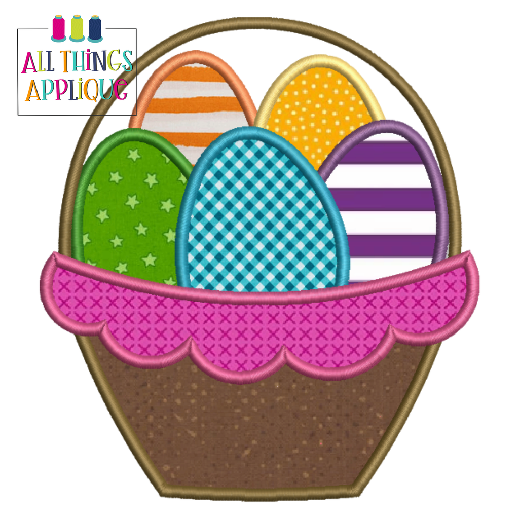 Hop into spring with this charming Easter basket applique design! Perfect for transforming fabric scraps into festive creations, this pattern features a cheerful basket overflowing with five large, colorful eggs. Ideal for quilts, pillows, wall hangings, shirts and more!
