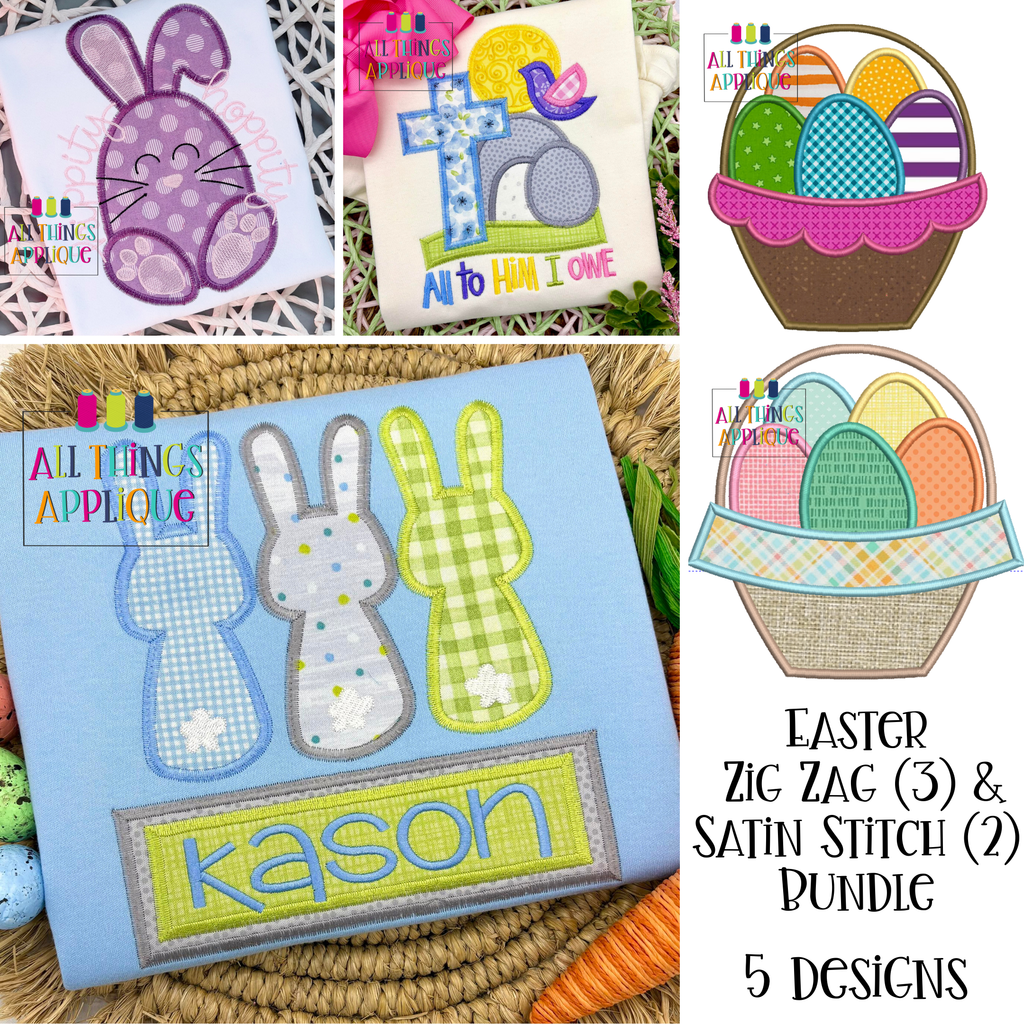 This design bundle includes 5 Easter Designs created/digitized in 2026 by All Things Applique for use on your embroidery machine.