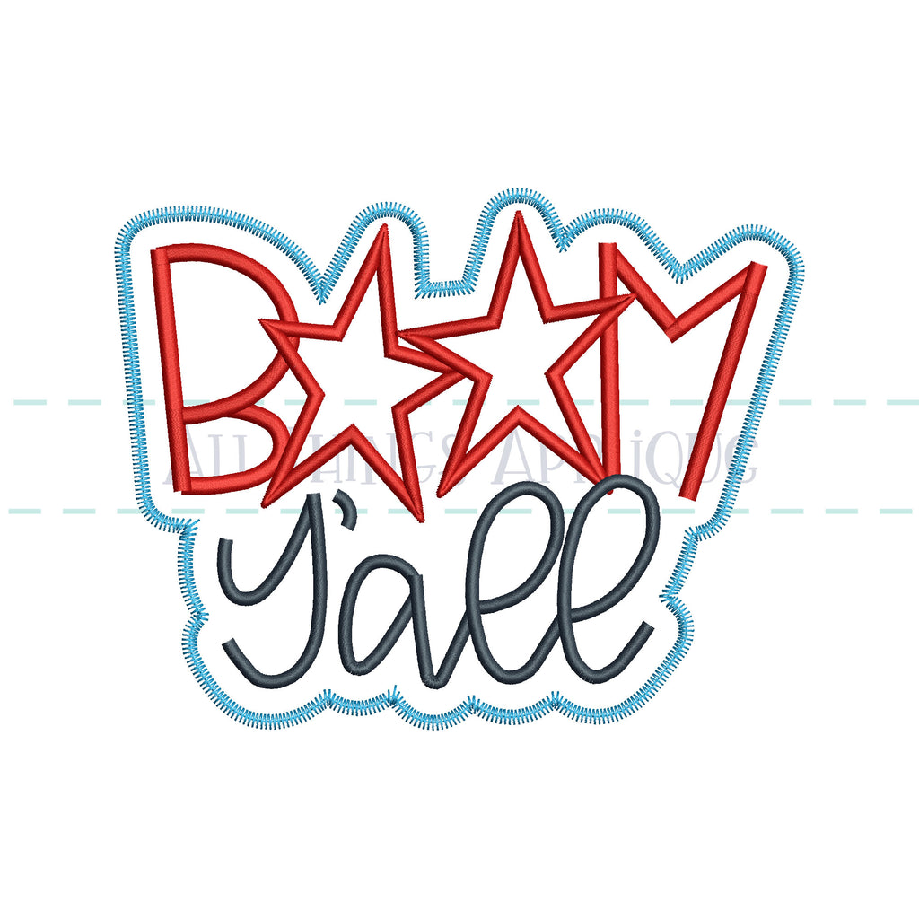 Rock your style with this 'Boom Y'all' double stack hand lettered applique design, sprinkled with stars!